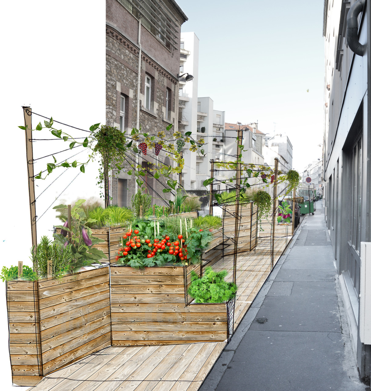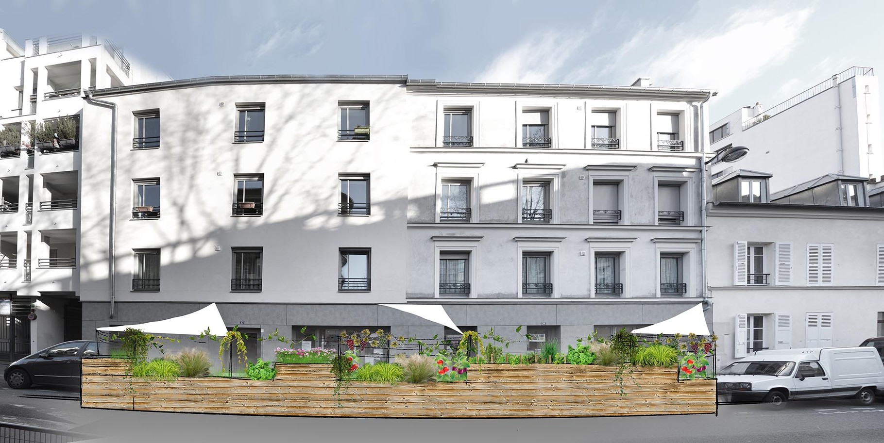 Dans le cadre du budget participatif d'arrondissement, et dans l'objectif d'une ville biodiversitaire et accueillante, ce projet multi-associatif propose la combinaison d'une terrasse de café-ludothèque à une pépinière. L'implantation de ces « terrasses/pépinières » se fait sur des places de parking de manière à amener vie et végétation dans nos rues sans gêner la circulation (piétons, vélos et voitures). Le gabarit de l'intervention se base sur la largeur des places de parking concernées (1,80cm dans ce cas). La longueur dépend du site d'installation et des besoins. Pour le site choisi comme exemple la longueur est de 19m, correspondant à l'emprise de la façade de l'association Natema.