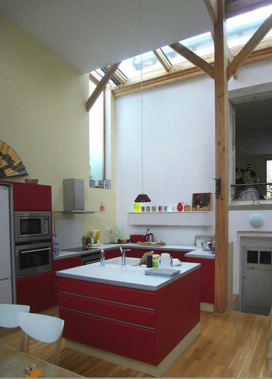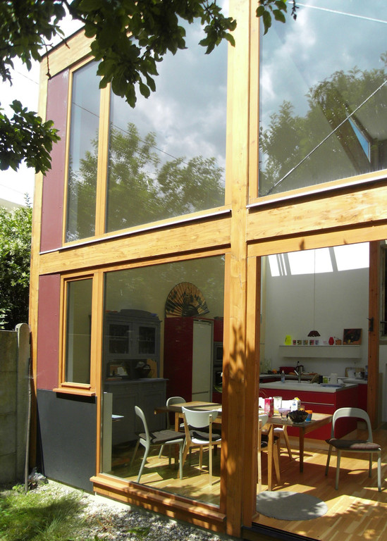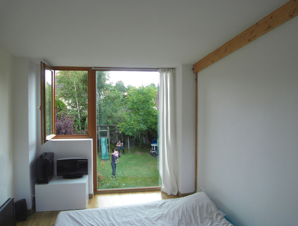 L'extension a permis de créer un lien fort avec l'extérieur par une vaste façade vitrée, offrant le bel espace de réception souhaité. La baie s'ouvre entièrement sur le jardin, et les châssis hauts sur la façade opposée permettent une ventilation naturelle en été. Au-dessus de la partie séjour se niche la chambre des parents, suspendue au-dessus du jardin.