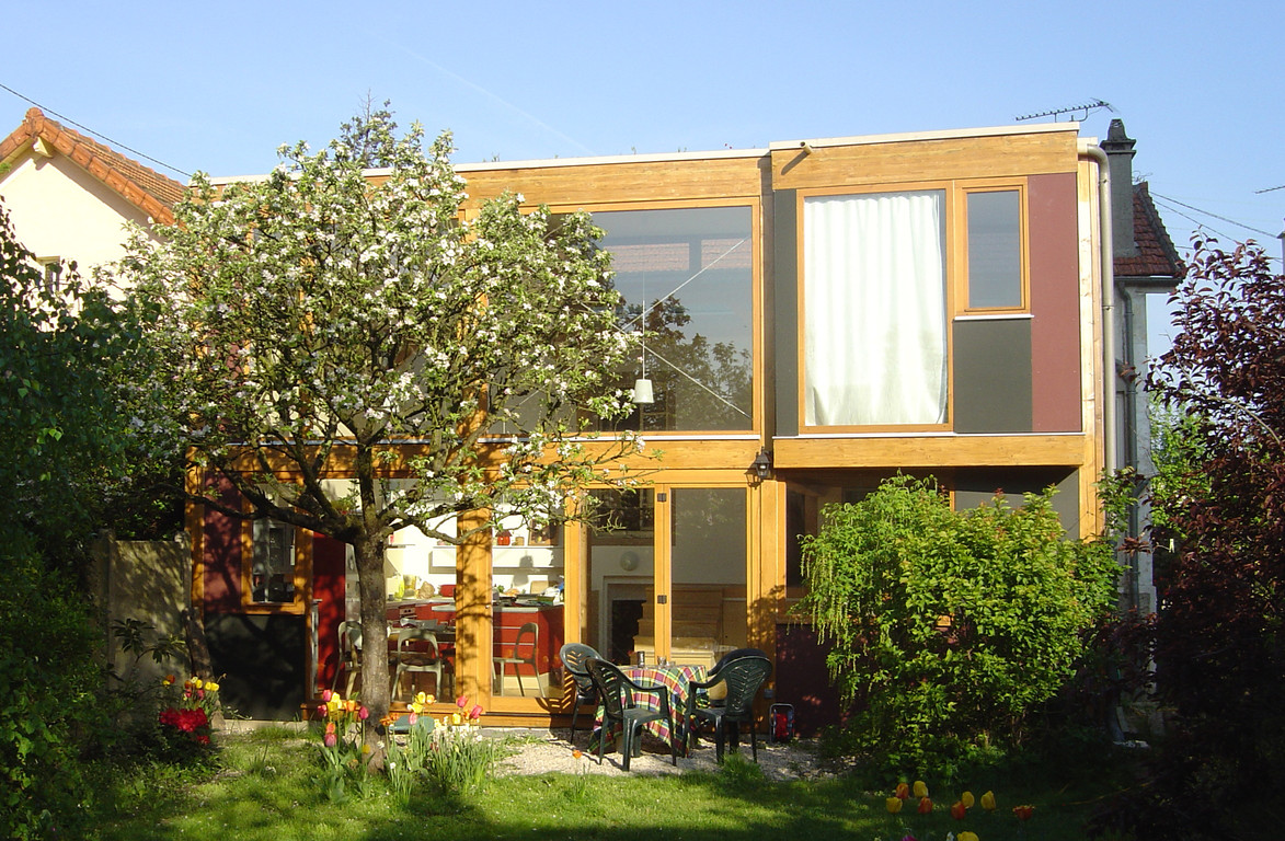 La conception s'est faite dans une démarche écologique et durable, poussée aussi loin que le permettait le budget : utilisation du bois non traité pour la structure (Douglas), isolation en laine de bois (14 cm dans les murs et 20 cm en toiture), toit végétalisé, chauffage solaire passif par les grandes ouvertures au sud-est, protégées des surchauffes en été par la végétation naturelle, plancher chauffant basse température. Menuiseries très performantes en mélèze. Le traitement du sol et les peintures réalisés avec des produits naturels sans solvants chimiques ni formaldéhyde. Enfin, des panneaux solaires thermiques sont prévus pour chauffer l'eau chaude sanitaire.