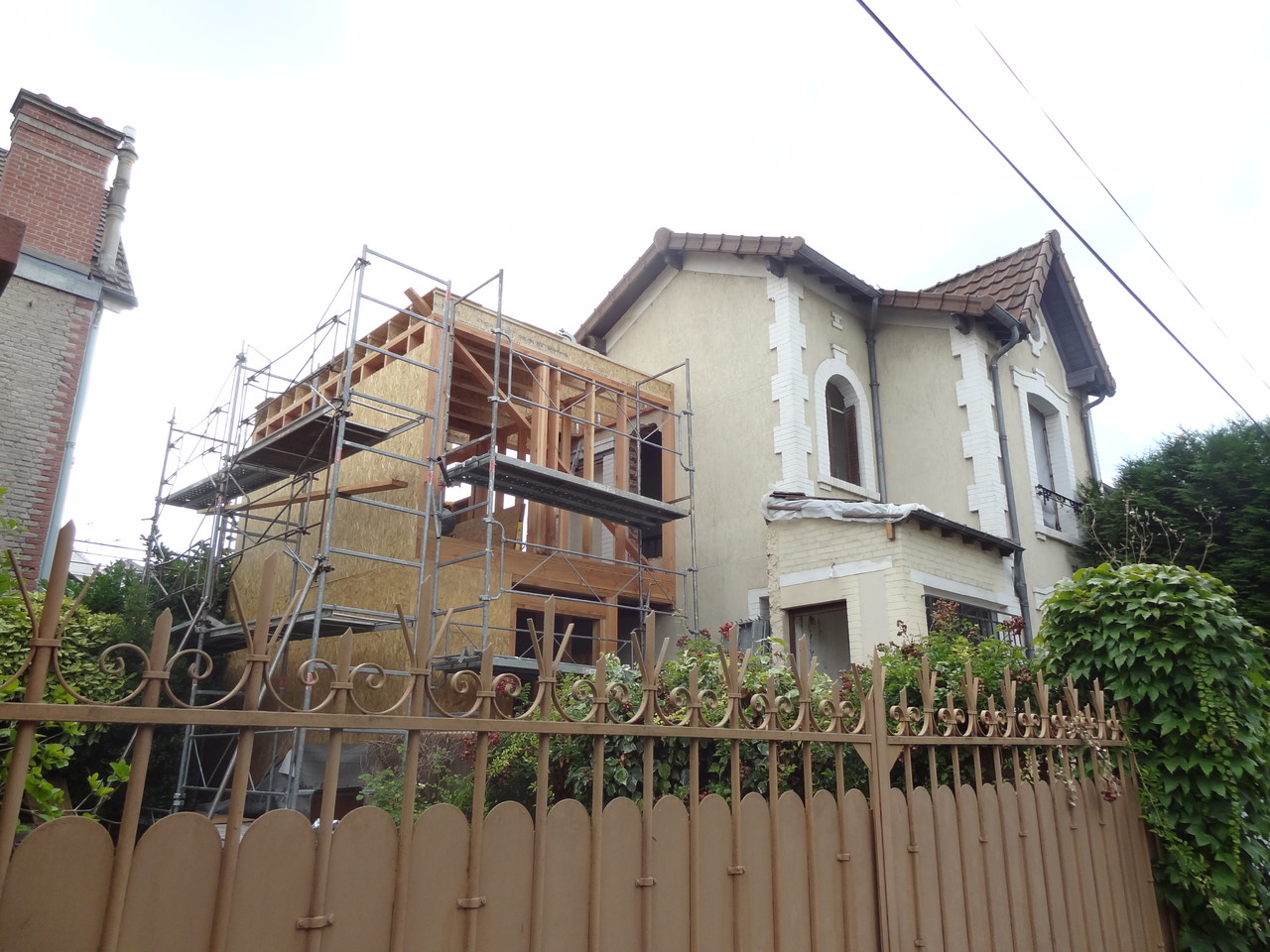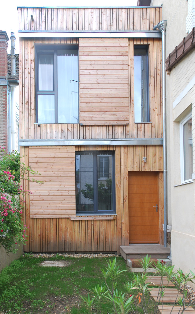 Le projet ne fait pas l'impasse néanmoins sur la qualité : l'extension est aux normes de la future RT 2012, en ossature bois avec 14 cm d'isolant (cellulose insufflée) + 6 cm à l'extérieur (panneau laine de bois rigide). Le toit-terrasse est recouvert d'une membrane. Les menuiseries sont en bois-alu.