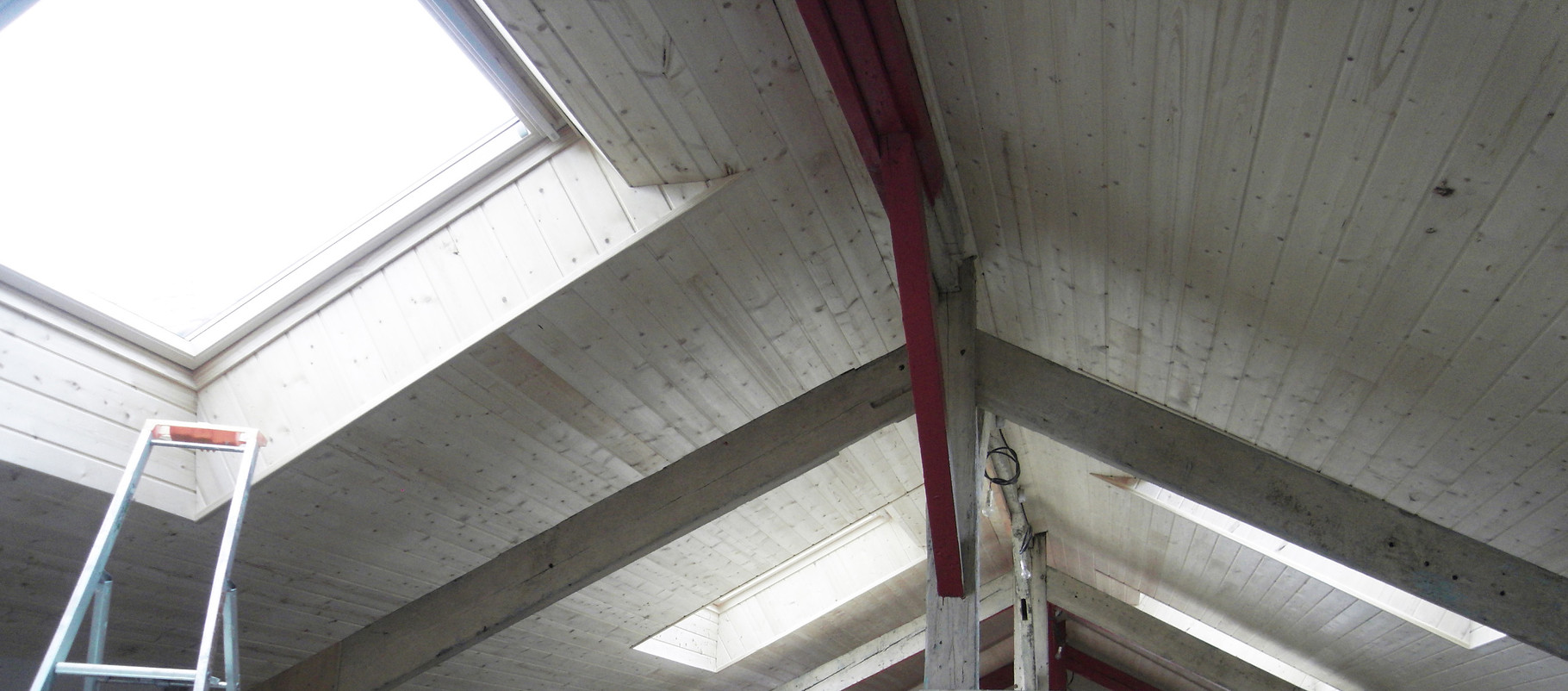 Le hangar au nord, en charpente bois, est conservé, isolé par l'intérieur. La toiture est isolée par l'extérieur, et accueille des panneaux solaires thermiques sur son versant sud. L'éclairage naturel est renforcé par de grandes ouvertures en toiture et vers le patio.