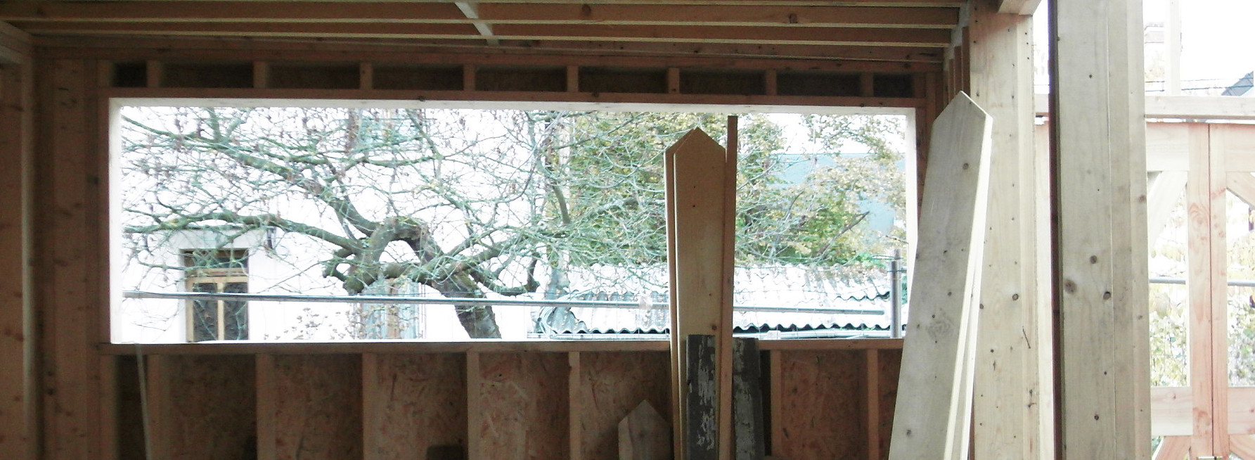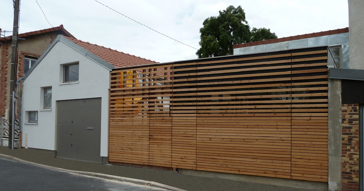 Les volumes hétéroclites au sud sont remplacés par un nouveau volume unique en structure bois, couvert par une toiture végétalisée extensive. Un pli sur la toiture, en retrait de la rue, permet de créer une façade supplémentaire, d'éclairer les pièces du fond et d'accéder au toit tout en respectant des normes urbaines très restrictives. Sur la rue, des clins plus ou moins ajourés en bois réunissent en une seule façade abstraite patio et habitation, laissant entrer la lumière tout en préservant des regards des passants. A l'intérieur, un mur en briques de terre crue joue le rôle de régulateur thermique, accumulant chaleur et humidité excessives, et les restituant lorsqu'ils font défaut.